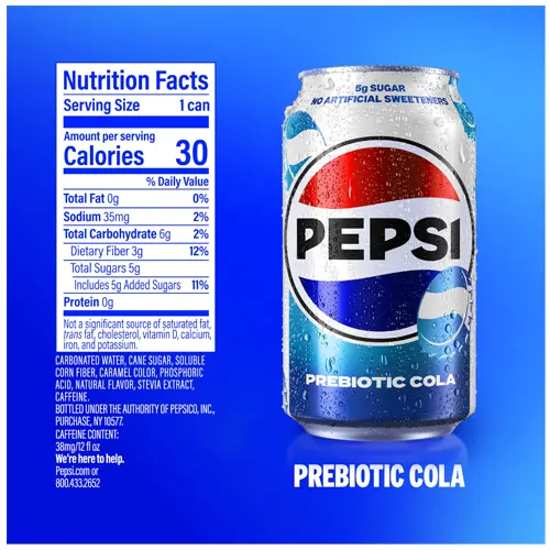 Pepsi Prebiotic Soda delivers classic cola taste with added prebiotic fiber for a refreshing and functional twist. A great choice for enjoying soda with a little extra benefit. 12 oz cans, 3 8-packs.